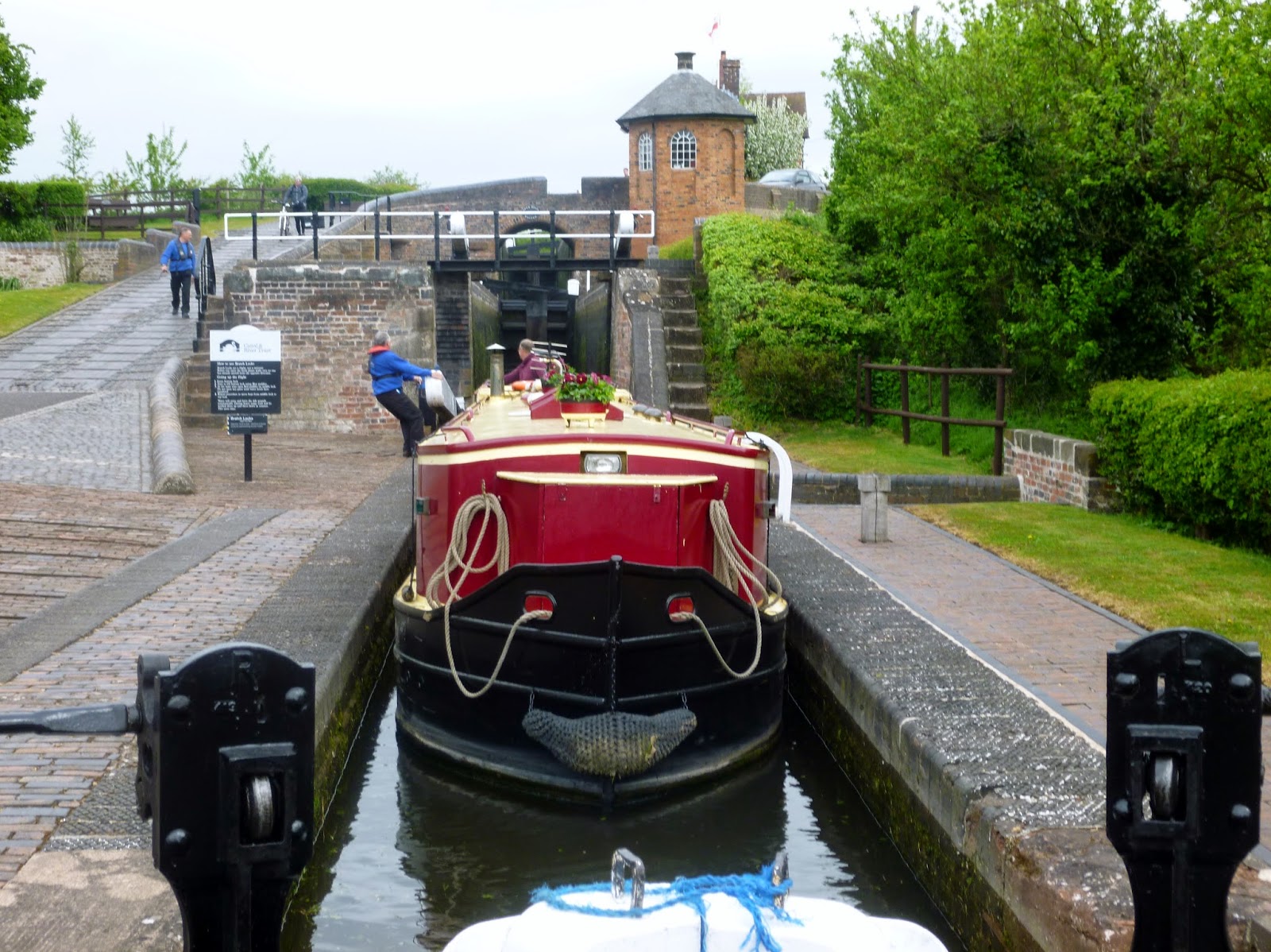 Same again in the middle lock except this time one red paddles is raised and the second more slowly to avoid flooding the bottom lock.